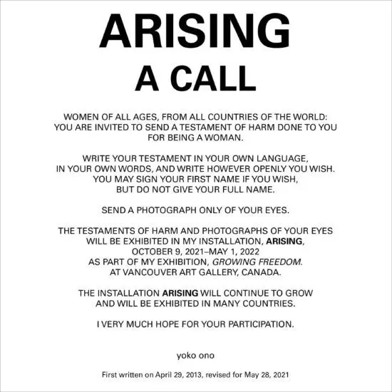 Yoko Ono: ARISINGSat Oct 9, 2021–Sun May 1, 2022 | 10–5 AMVancouver Art Gallery