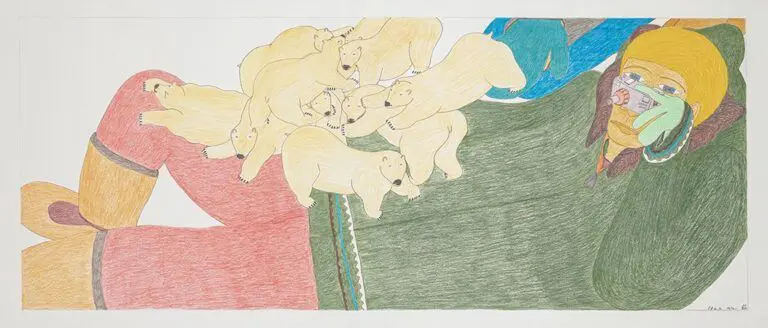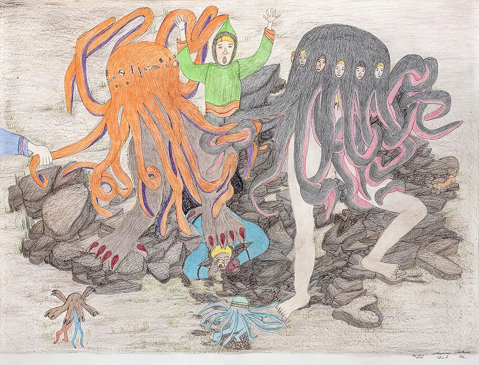 Shuvinai Ashoona: Mapping Worlds brings together a selection of drawings created by the acclaimed Inuk artist over the past two decades. Born in Kinngait (formerly known as Cape Dorset), Nunavut, in 1961, Shuvinai Ashoona comes from a long line of artists, including her grandmother Pitseolak Ashoona (1904–1983) and cousin Annie Pootoogook (1969–2016). While many of Ashoona’s drawings contain traditional Inuit motifs, she is best known for the imaginative way that she incorporates these and other cultural references to develop her own sophisticated and highly personal iconography. With imagery ranging from closely observed everyday scenes of her Arctic home to strange and fantastical visions, Ashoona’s brightly coloured drawings teem with life and blur the boundaries between fantasy and reality, past and future.
