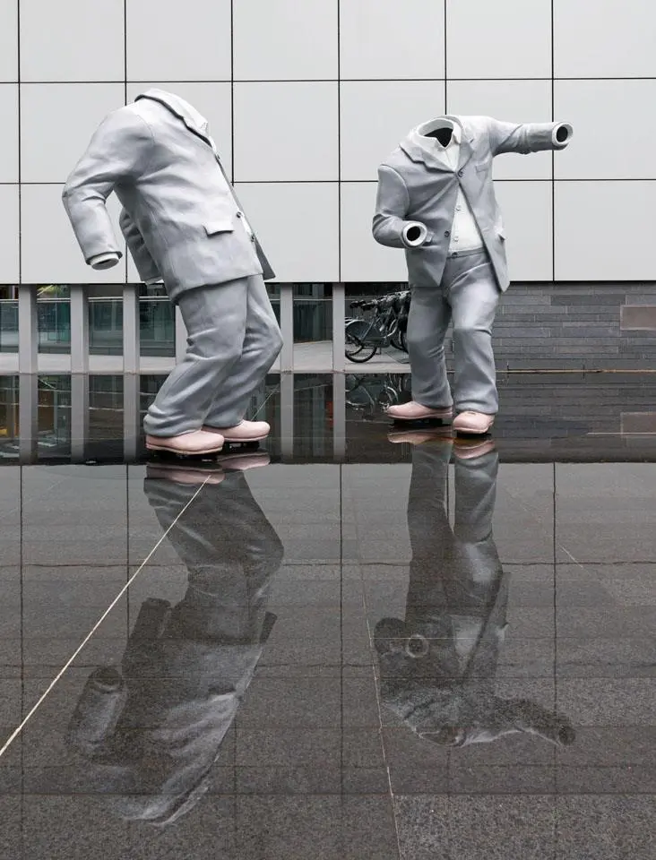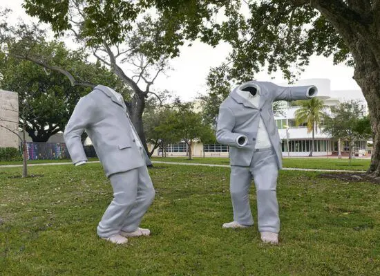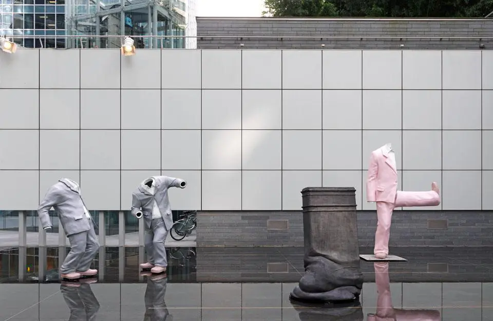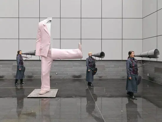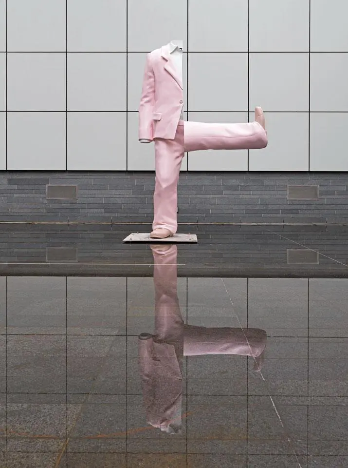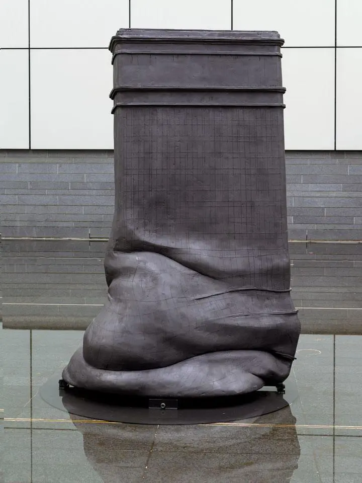 Inspired by Henry David Thoreau’s essay “Civil Disobedience,” Wurm’s Big Disobedience (2016) makes reference to the theme of political and social correctness. Half Big Suit (2016) consists of a figure fixed in an awkward position, one leg extended in the air, conveying the sense of distress experienced while undergoing a durational performance or holding a lengthy pose. The relationship between the organic transformation of the body through biological factors and the intentional moulding of objects in Wurm’s work is illustrated in his architectural structure, Flat Iron (2016). While Wurm considers humour an important tool in his work, there is always an underlying social critique of contemporary culture, particularly in response to capitalist influences and resulting societal pressures, which the artist sees as contrary to our internal ideals.