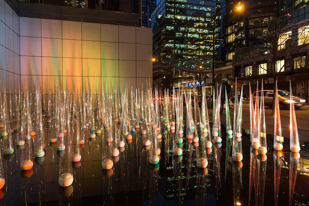 Vancouver artist Khan Lee’s Red, Green and Blue is a sculptural installation that uses filtered light to animate nature. Drawing on broad references of horizon lines and landscape art, Lee enables passers-by to visualize the wind.