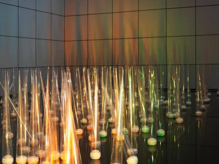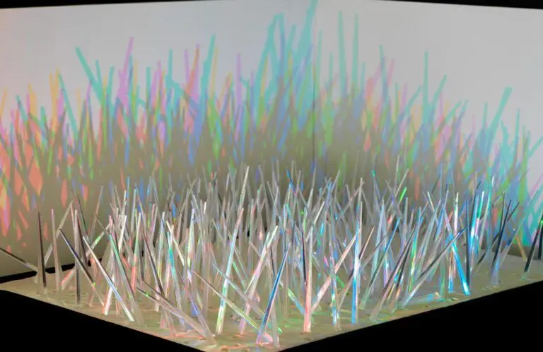Building on a sense of theatricality, Lee’s installation acts as an elaborate set comprised of three-dimensional objects that cast larger-than-life shadows against an enormous backdrop. Red, Green and Blue draws viewers into the intersections of artifice and nature within an abundant field of transparent cones fabricated from sheets of hand-folded plastic film. It is both painting and sculpture, using light filtered through red, green and blue lighting gels to project an immersive field of coloured grass-like forms on the architecture of Offsite.