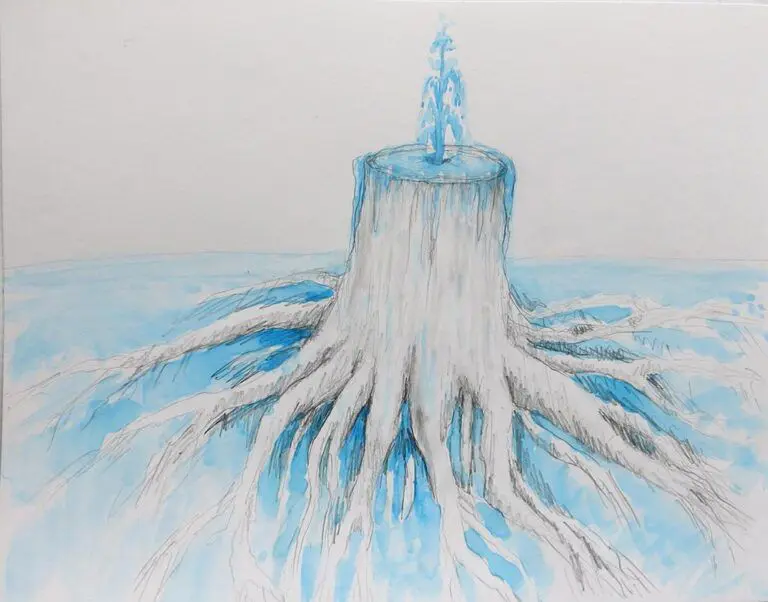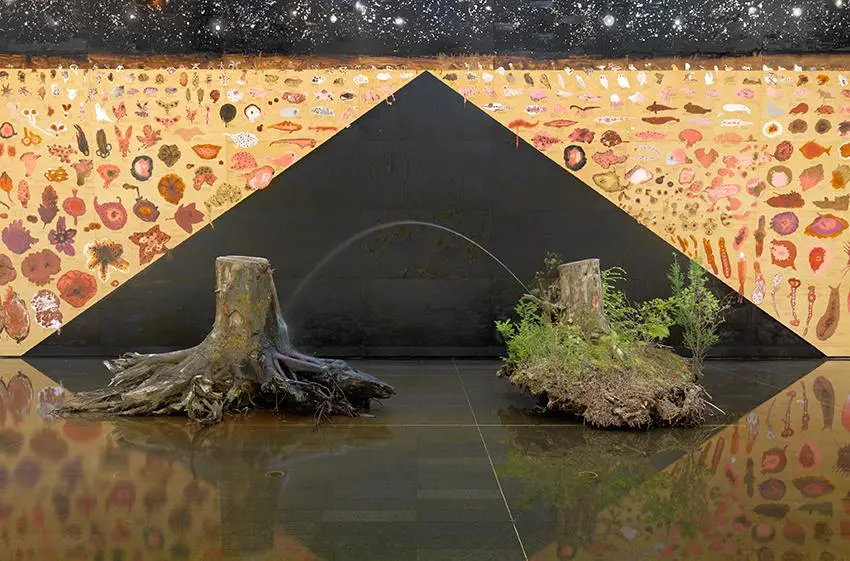 Marina Roy uses both natural and processed materials to create a 25 meter mural and tree fountain that stands out in contrast to the glass and concrete office towers in downtown Vancouver. Repurposing a tree salvaged after the 2015 windstorm into a fountain, surrounded by a mural painted with bitumen and latex paint, Roy’s installation Your Kingdom to Command speaks to transformation in nature, largely due to human industry.
