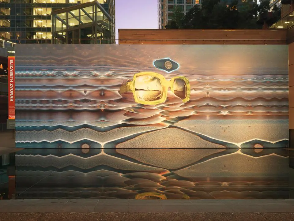 Vancouver artist Elizabeth Zvonar conjures romantic sentiment and melancholic undertones in The Experience, a bleached-out collage that boldly positions itself in downtown Vancouver during the dreary winter months. A pair of sunglasses in the foreground of a celestial landscape from Mars reads like a postcard from the future. The eighteen-metre banner is framed by a reflective pool of water and colour. The Experience combines the materials and strategies employed in advertising to create tangential connections between social agency and advertorial entertainment. Zvonar’s ambitious reproduction of a hand-cut collage is presented as part of MashUp: The Birth of Modern Culture, a major group exhibition tracing the history of mashup culture across diverse disciplines, presented at the Vancouver Art Gallery from February to June, 2016.