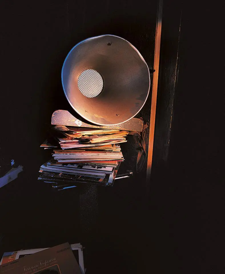 mixed media installation, with audio, record players, records, speakers and synchronized lighting,
