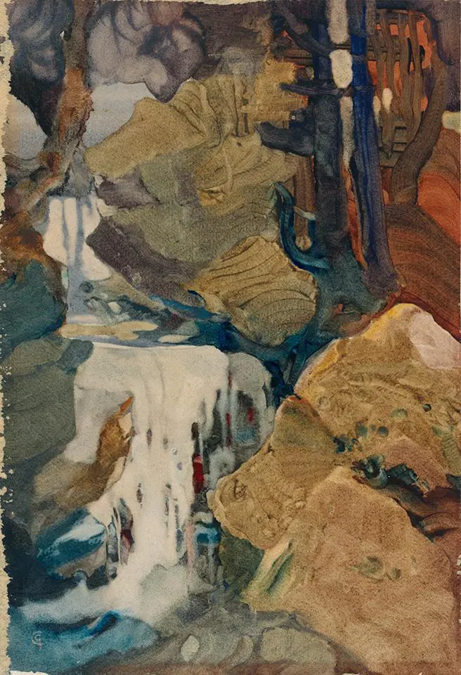 Emily Carr generally used watercolour as a “means to an end” and the works she produced in the medium were often conceived as studies for oil paintings. The shift between Carr’s early works–several of which show considerable manipulation of materials–and her later watercolours is striking. In contrast, Charles John Collings, who established a career as a watercolourist before coming to Canada in 1910, conceived of and used the medium in most of his work. Collings’ paintings are renowned for their subtlety of colour and complexity of technique, which often involved such measures as wet-on-wet application of paint, lifting areas of pigment, or burnishing the surfaces of completed works to achieve the desired effect. Both artists used watercolour as an important and vital part of their work in depicting the landscape of British Columbia. There is again, however, another remarkable difference: Carr’s work is firmly rooted in the real while Collings’ images are largely from the realm of his imagination.