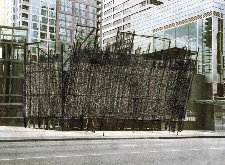Plaza mimics the most prosaic form of the urban built environment–the gridded box–and forcefully twists it by a mere 8-degree shift, enough for its walls to seem on the verge of collapse. The warping is, however, halted at a precise point, suspending the structure in a play of distortions and perceived imbalances, where it appears to be carefully held in balance between falling and flight, weight and levity, solidity and transparency. Plaza evokes a pivotal moment of architectural and societal transformation and metaphorically suggests that the mechanisms which underpin the modern city are far more fragile than we imagine. Its burnt surface and collapsing form infer a cautionary tale for the future, as well as an invocation to transform the modern city.