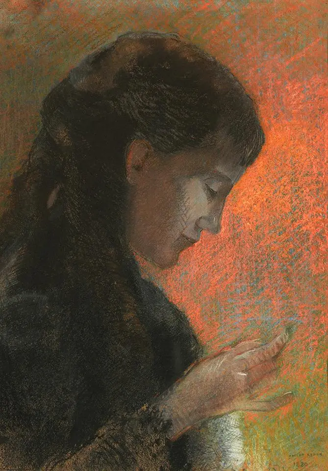 Madame Redon Embroidering, in Profile / Portrait de Madame Redon brodant, vue de profil, 1880