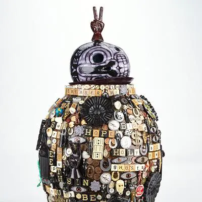 Jan Wade, Memory Jug, 2016 (detail), acrylic, found objects, Collection of Surrey Art Gallery, Photo: Dennis Ha