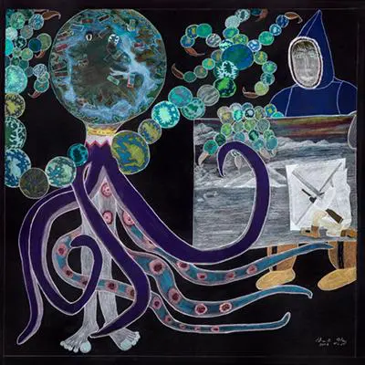 Shuvinai Ashoona, Earth Transformations, 2012, Fineliner pen, coloured pencil and Conté crayon on black paper, Collection of Martha Burns and Paul Gross