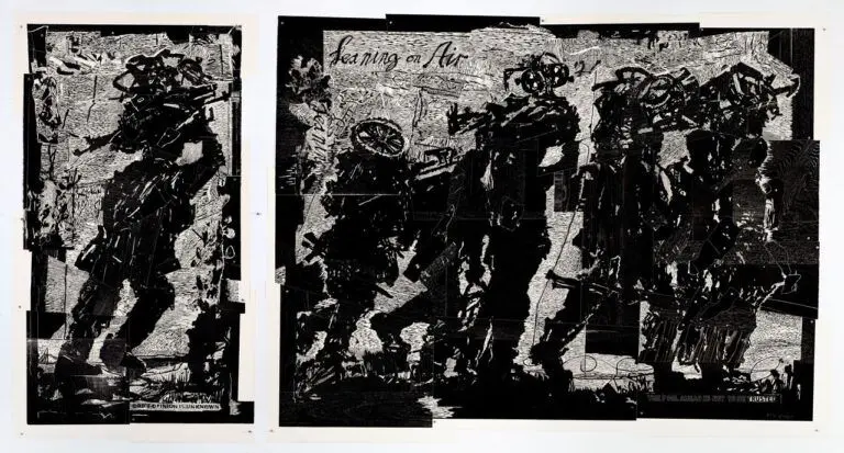 William Kentridge, Refugees (1. God’s Opinion is Unknown; 2. Leaning on Ai, 2018–21, 26 woodblocks on 77 sheets of paper, aluminum pins, Collection of the Vancouver Art Gallery, Promised Gift of Brigitte and Henning Freybe, Photo: Thys Dullart, Courtesy of David Krut Projects