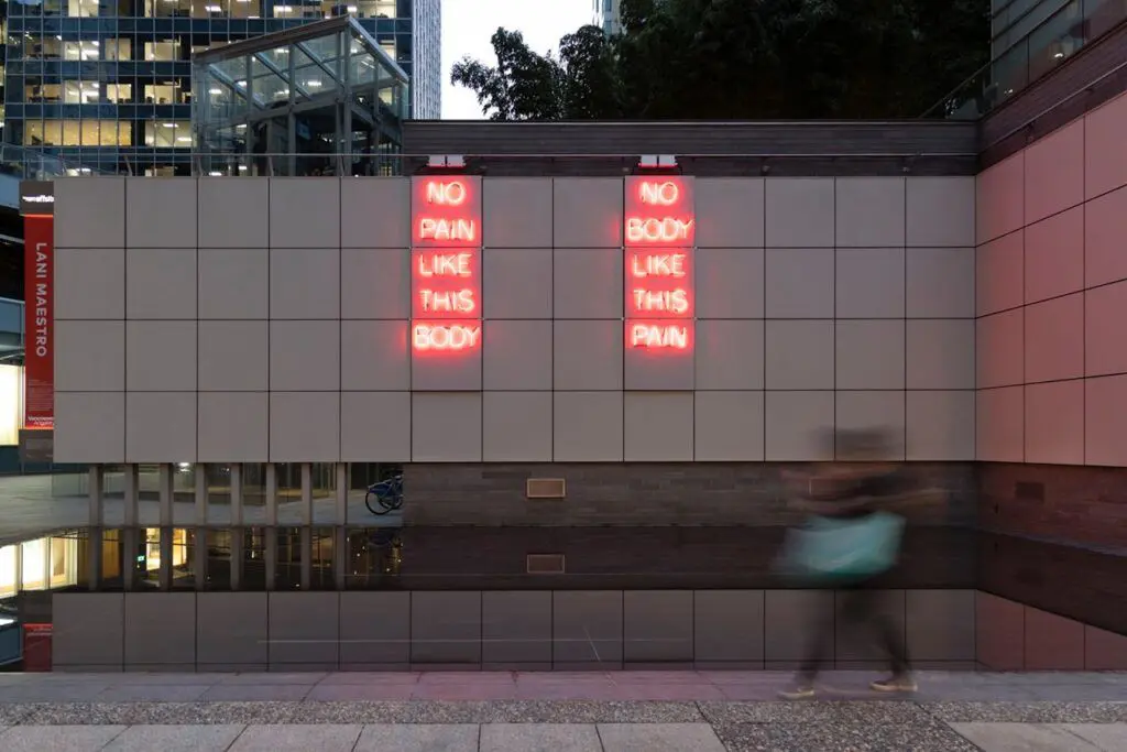 [Image Description: This work is a red neon sign diptych installed at the outdoor Vancouver Art Gallery Offsite at 1100 west Georgia Street. The exterior wall has a surface grid of large grey tiles. Each of the two neon statements fills three vertical tiles, installed two columns apart. The words are stacked vertically, one below the other. On the left, text reads: “No Pain Like This Body.” On the right, text reads: “No Body Like This Pain.”]