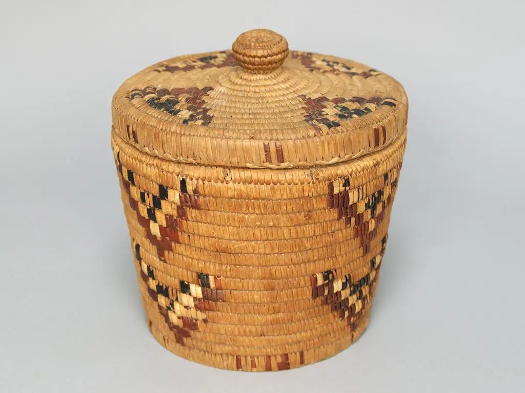 Sewiṉchelwet (Sophie Frank), coiled storage basket, n.d., cedar root and sapling wood, wild cherry bark, Collection of Richard Daly and Liv Mjelde, Photo: Kyla Bailey