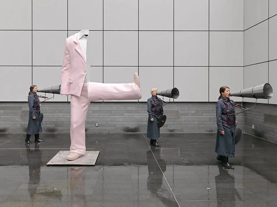Ledgers is a vocal music composition based on contemporary madrigals. Three singers dressed in costumes inspired by industrial workwear respond to the surrounding urban landscape with their voices and bodies. Throughout the performance, the singers use their costumes and movements to block, direct and support their collective endeavour—the completion of the song.