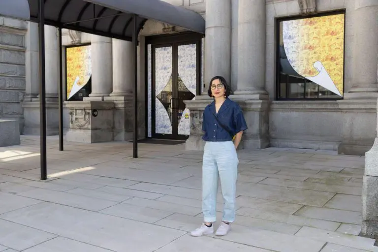 Artist Janet Wang with her work in/visible, 2018/2024, for SPOTLIGHT, window installation, Photo: Vancouver Art Gallery