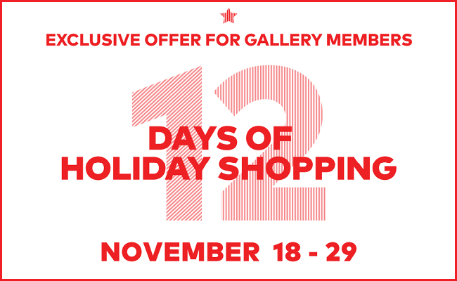 Visit us to find a fantastic selection of holiday gift ideas online and in-store! Present your valid Membership Card at checkout to redeem these offers on site. Use the discount code “HOLIDAYSHOPPING” to receive 20% off regular-priced items online through the Gallery Store!