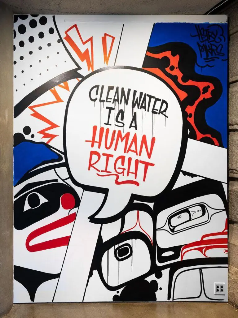 ![[Image Description: KC Hall stands on a ladder, adding finishing touches to his mural in the Gallery Lobby. The mural is painted across 2 perpendicular walls in a Pop Art and graffiti style, infused with Pacific Northwest Coast art elements. The colours red, black, white and blue are dominant. In the top left corner, a word bubble contains a statement that reads: “Omg! I heard the potlatch ban is over!” On the right, another word bubble contains the statement: “#Sacred A F.”]](webp/kc_hall_process_mural-2-1024x683.jpg.webp)