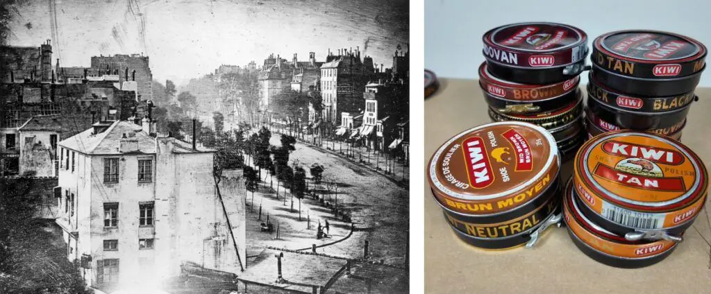 (Left) Louis-Jacques-Mandé Daguerre, Paris Boulevard (or View of the Boulevard du Temple), 1839, daguerreotype; (Right) Shoe polish tins from Evan Lee’s studio, 2024