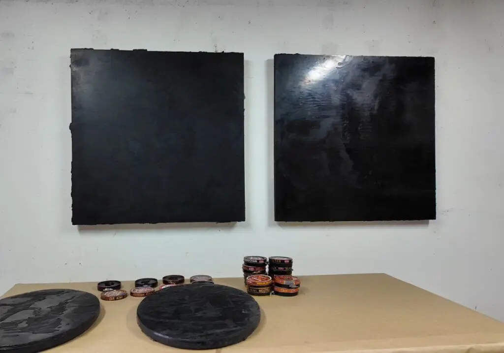 Later, I decided to make a pair of large paintings, also black squares. For this, I made my own shoe polish with beeswax as a base. It was a slightly elevated version of shoe polish but based on a traditional and all-natural formula. It was much safer to work with and is more durable and archival. And so, one of these two paintings is the one in the exhibition.