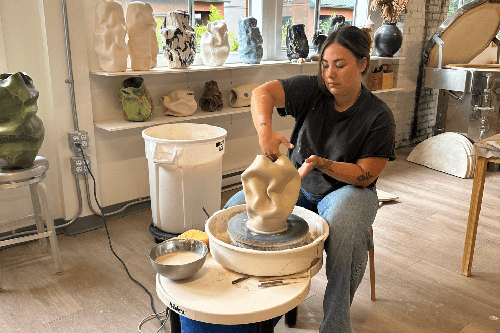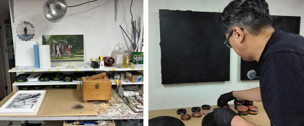 (Left) Evan Lee’s studio, 2024; (Right) Evan Lee working in his studio, 2024