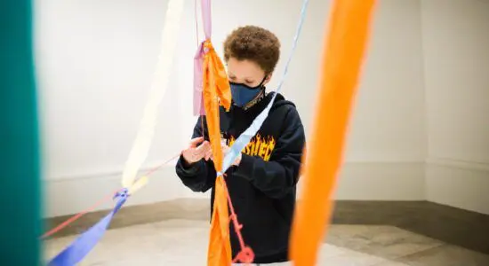 To prepare for this exhibition, Susan Rome, the Gallery’s Program Coordinator for Schools and Youth, made weekly visits to three classrooms across Greater Vancouver in November and December 2021. Presenting them with photographs of the artworks, Rome asked students to observe the works’ formal attributes, reflect on the themes evoked and imagine the intentions of the artists. She then invited students to write down or verbalize their responses, create their own drawings and collectively move their bodies, using the artworks as inspiration. Two of the exhibition’s artists, Evan Lee and Brendan Lee Satish Tang, also visited the classrooms to discuss their art practices and engage directly with the students. This exhibition is the result of that vibrant process. Highlighting young voices—and a future generation of art lovers—Kids Take Over foregrounds the spirited, curious, thoughtful, whimsical, funny and often unexpected responses of students to artworks by local, national and international artists. Photographs of the students taken by photographer Anita Bonnarens show some of the activities leading up to the exhibition.